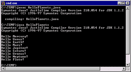 C:\Temp> javac HelloPlanets.java C:\Temp> java HelloPlanetsThe following shows this being done: