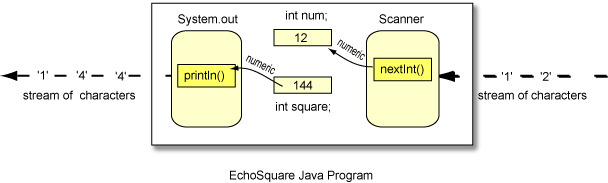 Next the program does some arithmetic with the numeric data in num and stores the result in square. Finally the result is sent to println which converts the numeric result into characters and prints them out (along with some other characters).